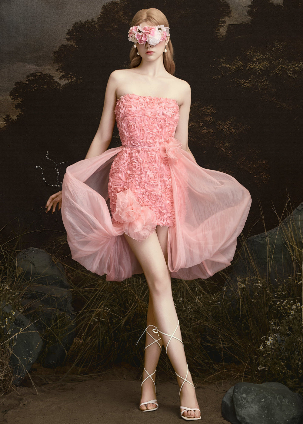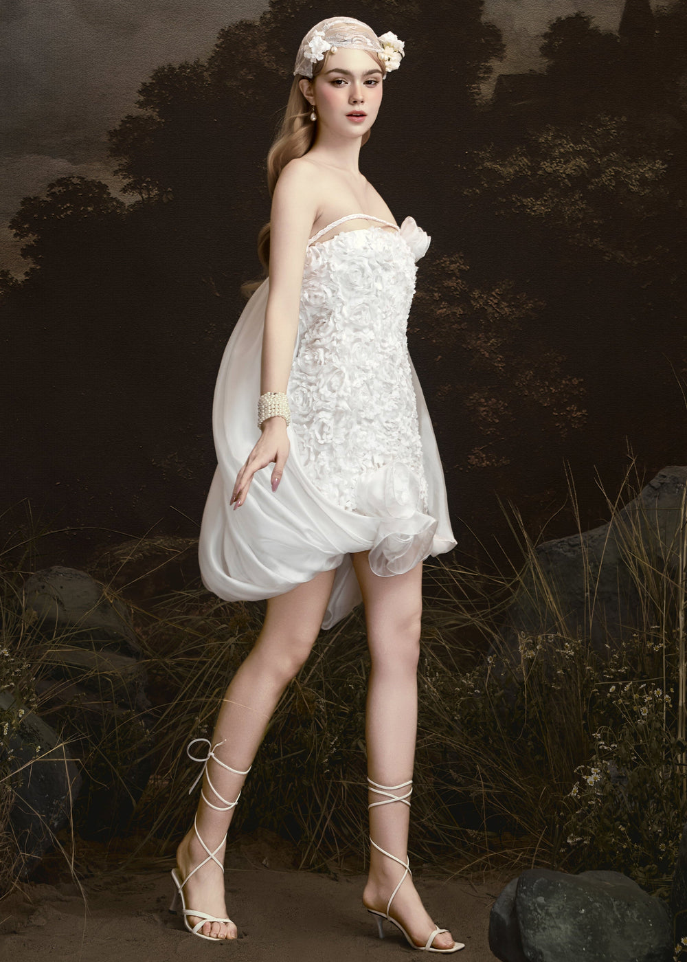 CLOUDY dress captivates with exquisite handcrafted 3D floral details and layers of soft, airy voile, light enough to transform into multiple styles: a seductive strapless look, an elegant off-shoulder silhouette, an artfully draped overlay, or softly tied at the waist to create a misty, cloud-like volume.