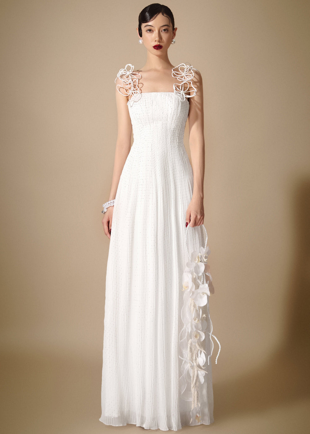 EVA dress is crafted from premium crystal chiffon, offering a soft, fluid structure. The entire bodice is hand-pleated, with each fold individually shaped to create gentle vertical rhythms that elongate the silhouette and enhance a sense of serene elegance.