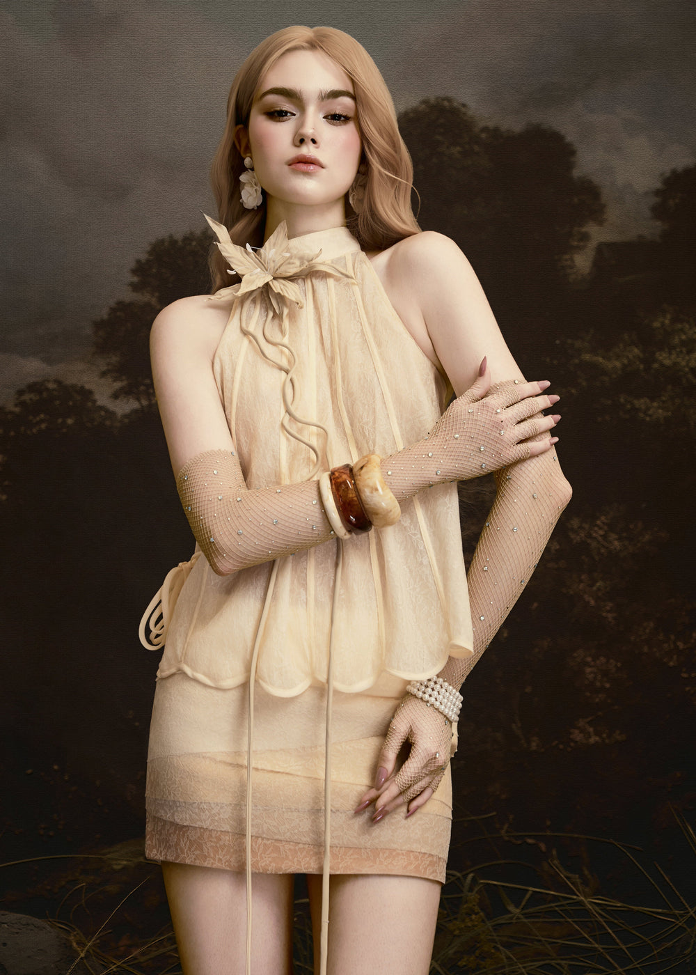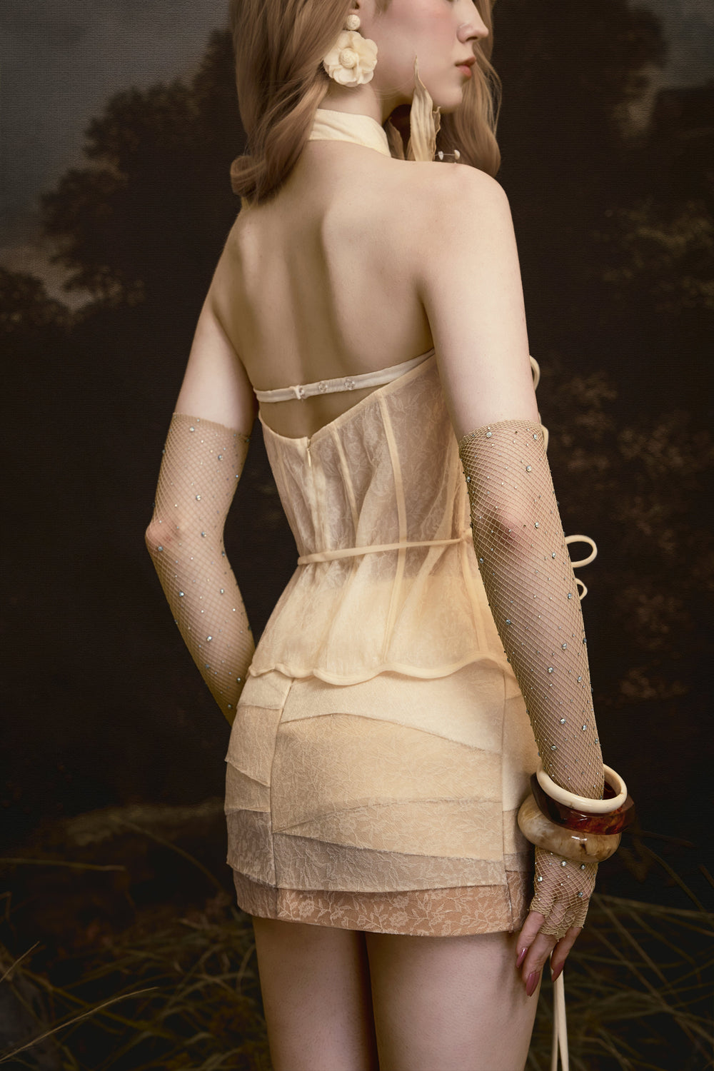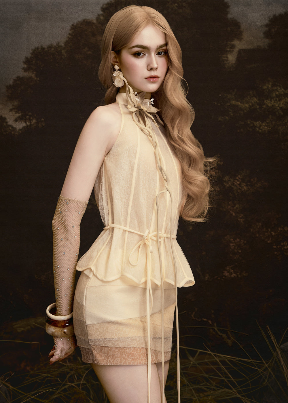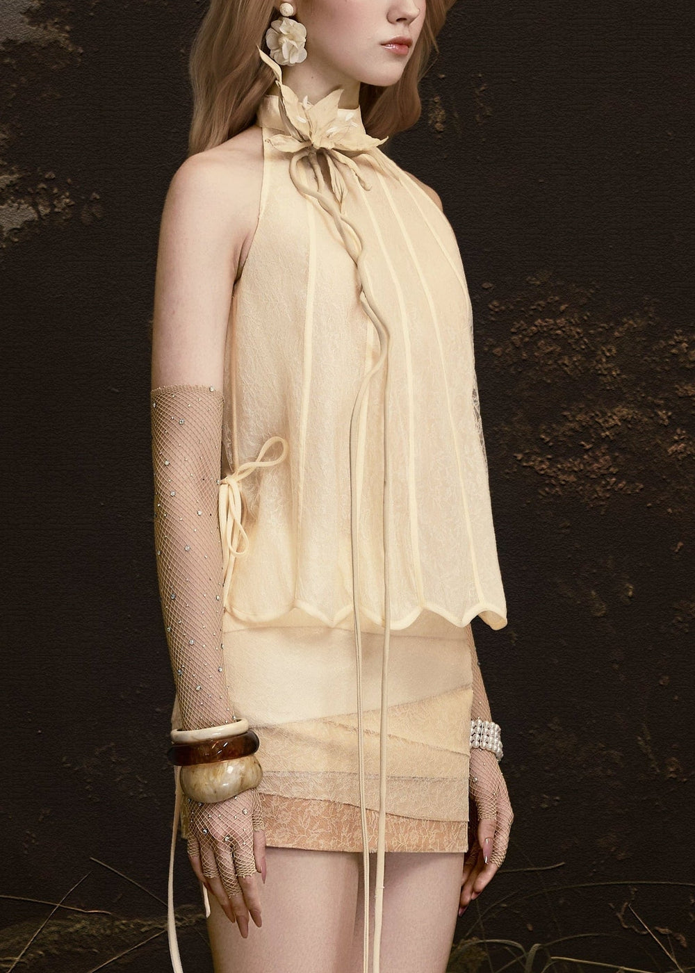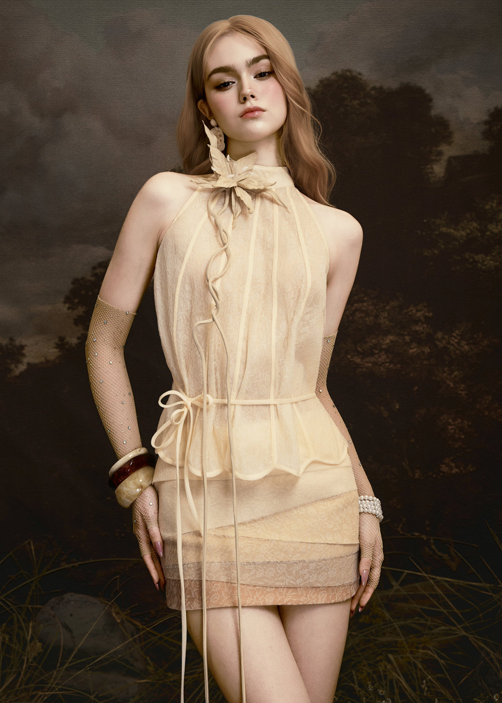 GAIA set— a symbol of pure beauty and boundless vitality — evokes a sensation as light as breath, yet irresistibly captivating. Premium airy chiffon is treated with a seamless gradient effect, creating natural visual depth, as if light were drifting through layers of clouds. Interwoven among the chiffon are delicate lace details, intricately cut and pieced to form gentle transitions that enhance the fluidity of the silhouette.