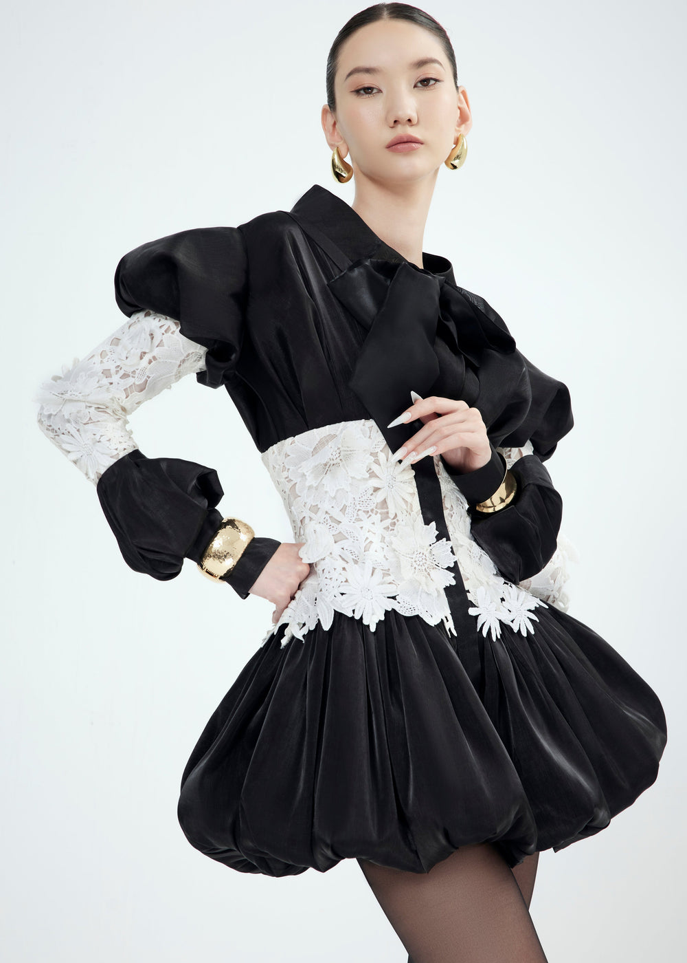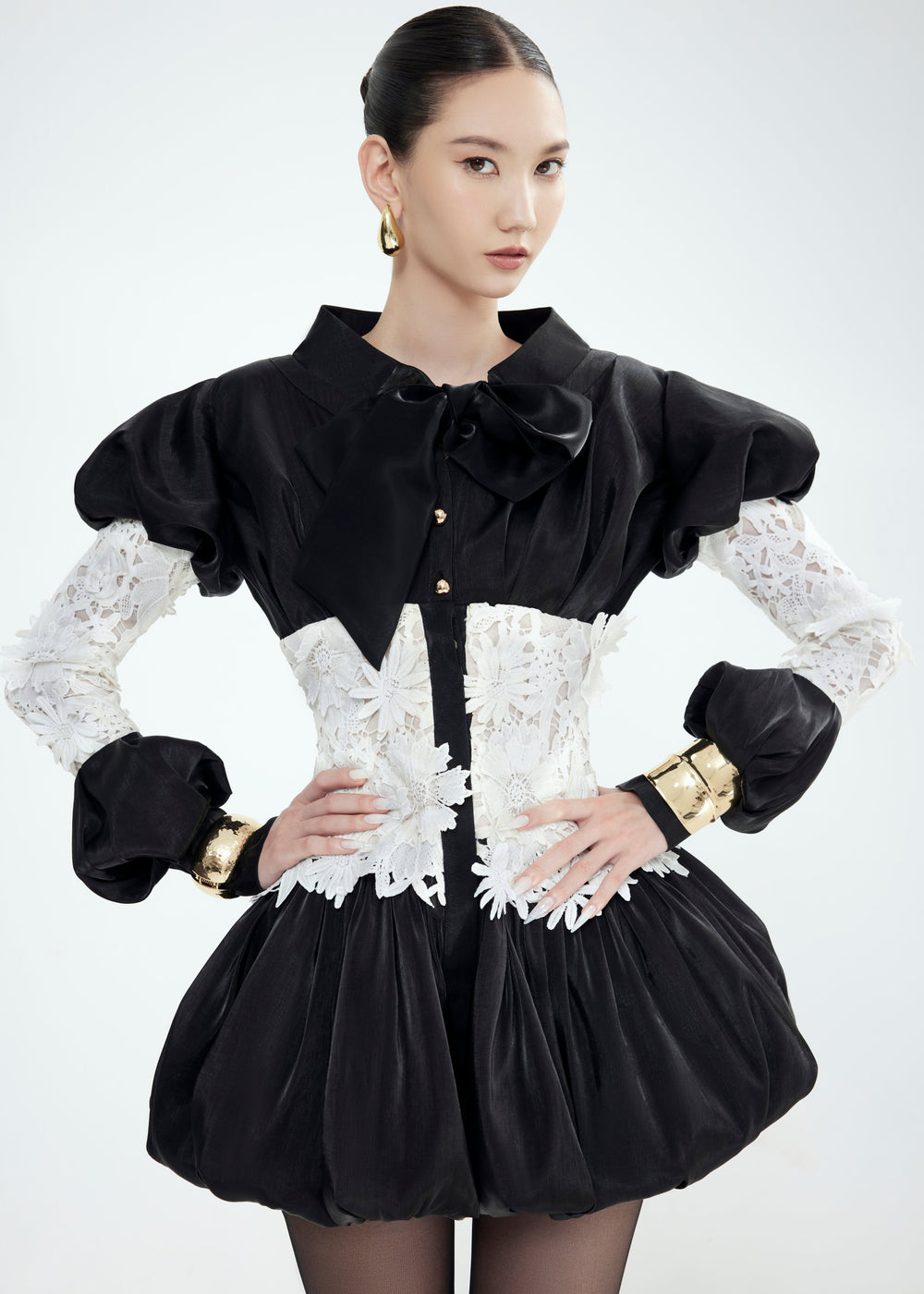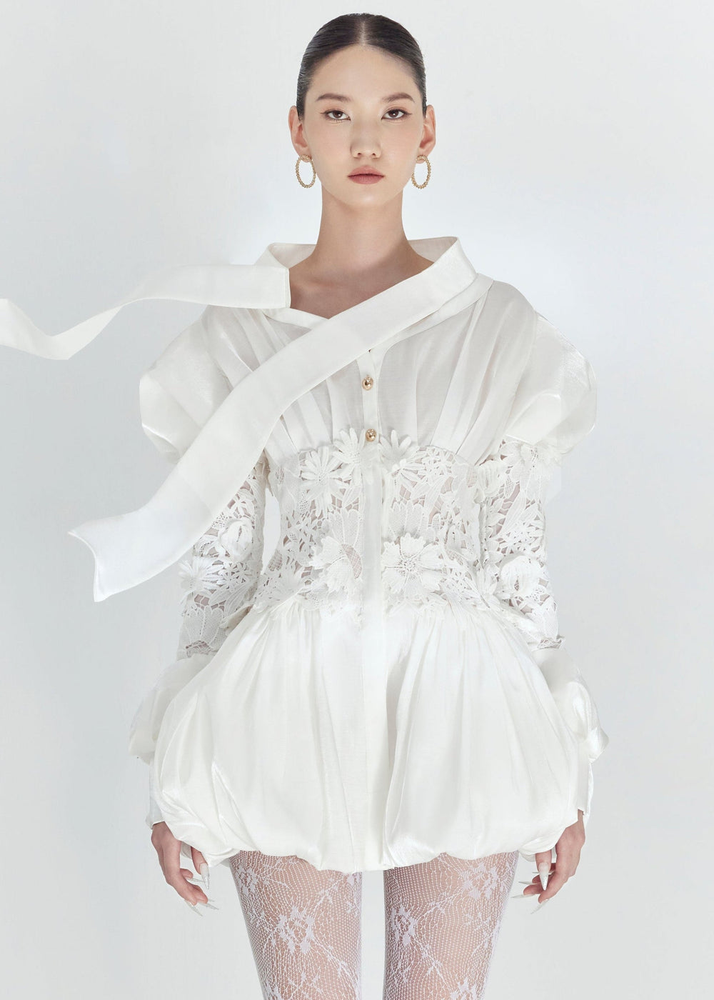 LACY ELEGANCE is crafted from exquisite 3D floral lace, gently contouring the waist and sleeves to create a soft, graceful silhouette that highlights the refined charm of an elegant lady. The voluminous sleeves carry a classic spirit, paired with a versatile neckline tie that can be styled into a delicate bow or left to flow freely, adding a touch of modern romance. A design that is refined, elegant, and timeless.