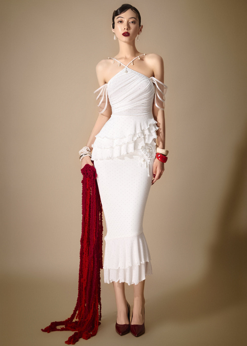 The skirt is finished with tiered ruffle layers, offering graceful movement while shaping a design that is both structured and ethereal.