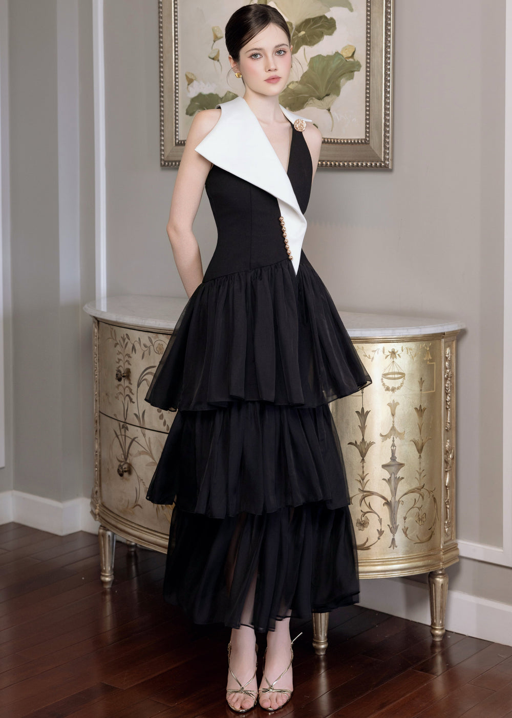 MAJESTIC REVERIE dress is created to honor that very spirit. The familiar V-neckline is reinterpreted with a modern, sharp approach, offering elegance while preserving a sense of authority. The tiered chiffon skirt flows softly with each step, creating an airy movement that brings the design into perfect balance — between power and femininity, strength and grace.