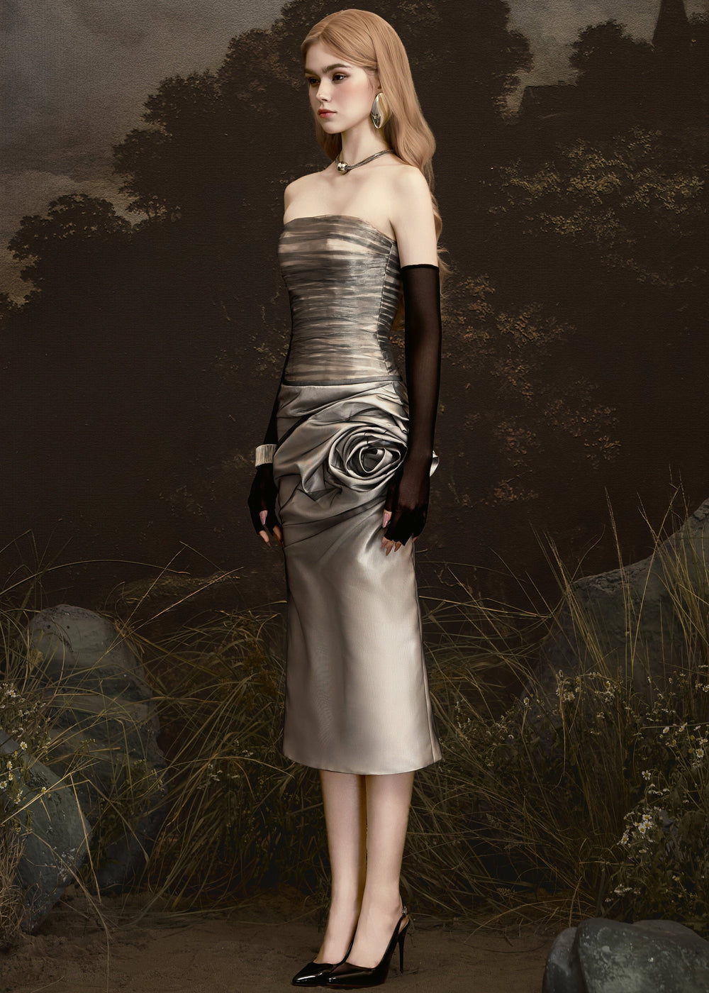 Inspired by Melpomene, the Greek Muse of tragedy, this design evokes a powerful beauty hidden beneath a fragile exterior. Layers of chiffon and metallic silk are delicately draped and paired with premium taffeta, creating an effect reminiscent of rose petals unfolding through mist. The MELPOMENE dress is a captivating contrast — proud yet mysterious, sensual yet refined. An iconic creation where emotion is distilled into form and movement.