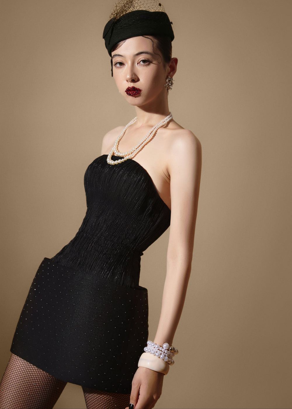 NOCTURNE set radiates a mysterious black allure, crafted from premium pleated silk with a refined drape and a luxurious surface effect. The pencil silhouette closely contours the body, creating a sleek, elongated line that is both delicate and powerful.