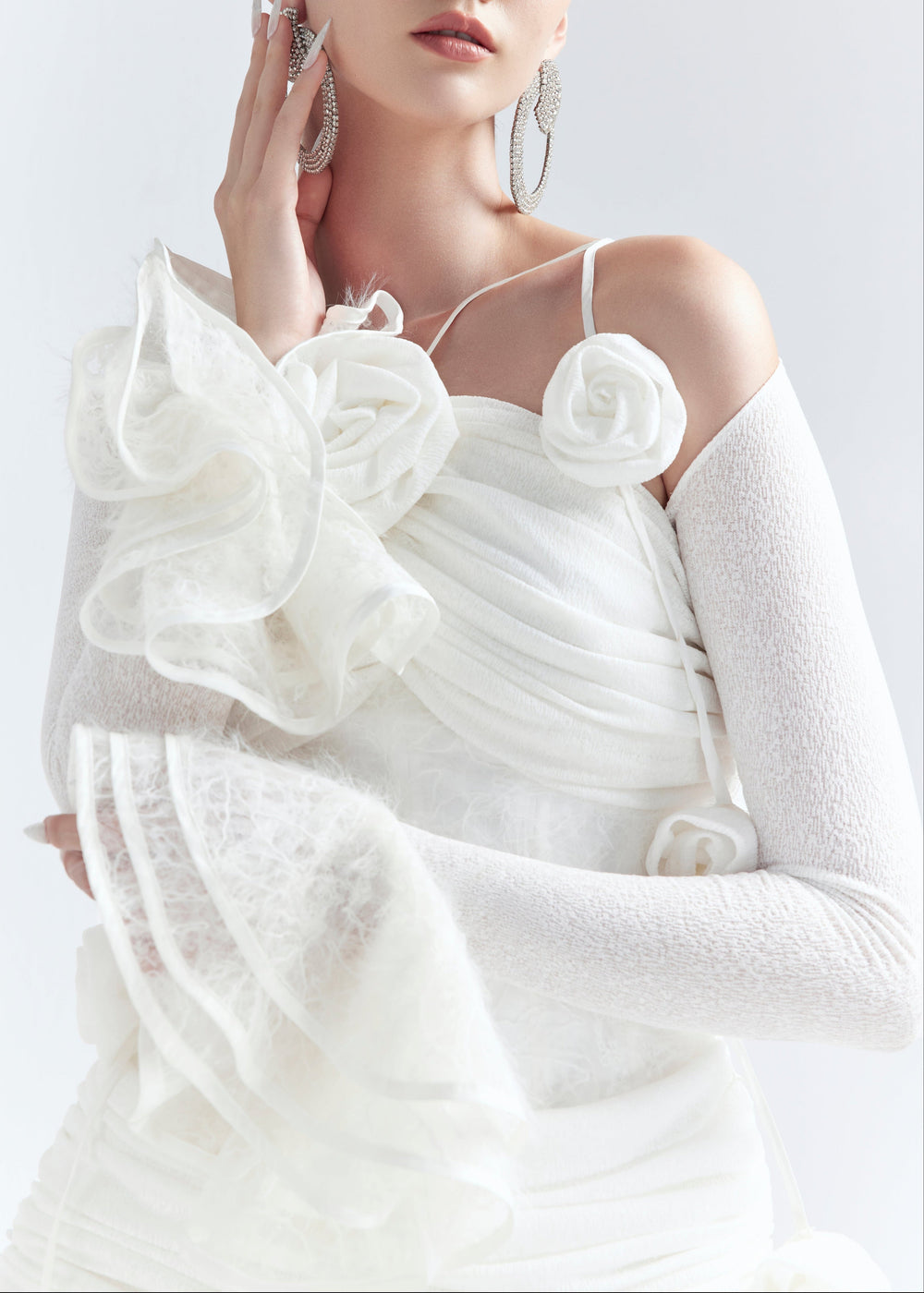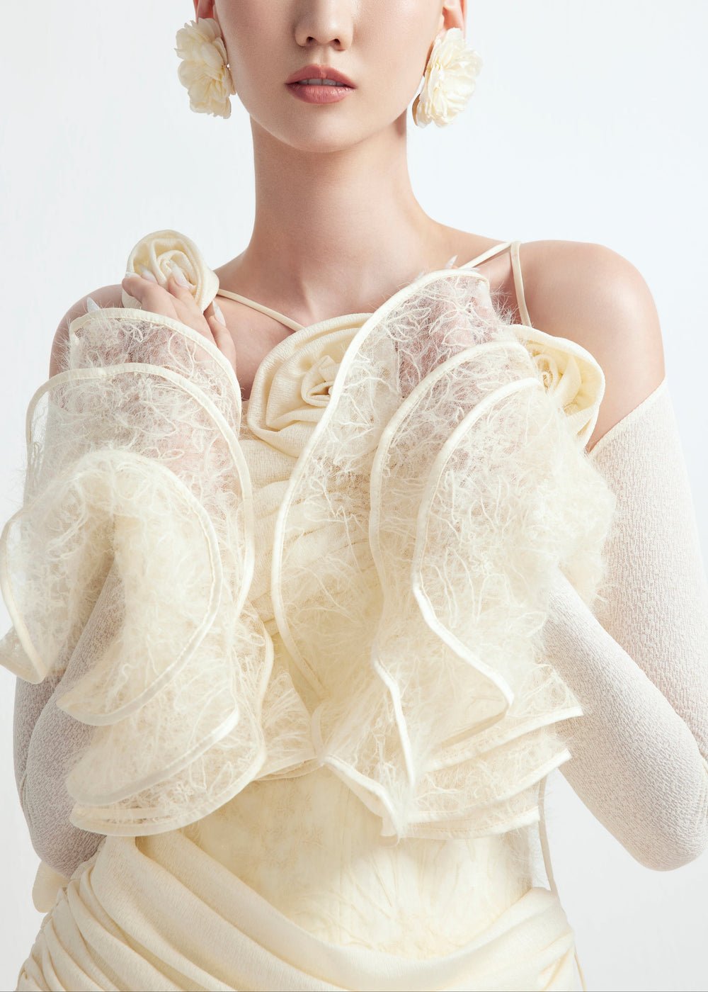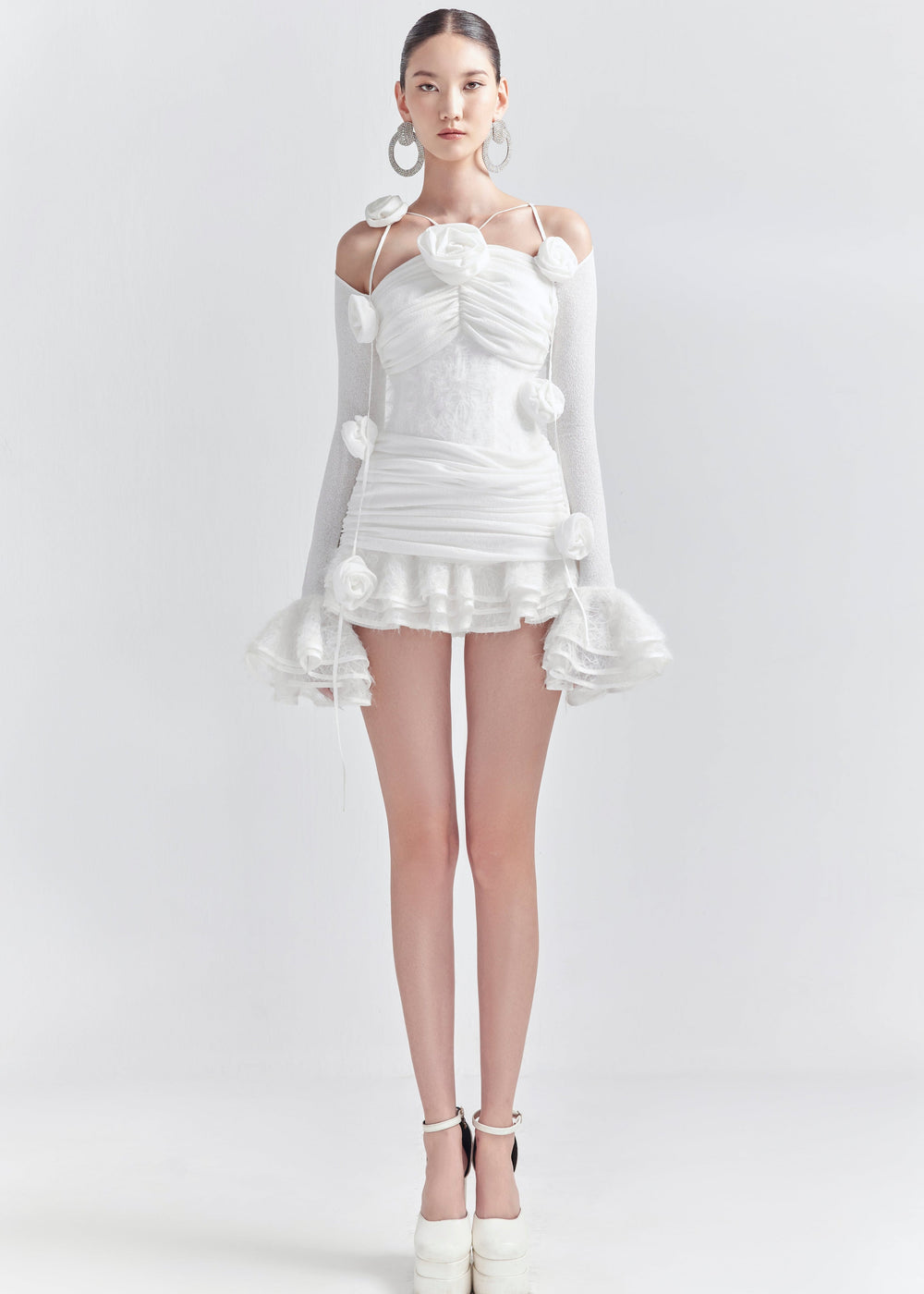 ROSEY BLISS dress is a statement of the modern woman — sweet yet full of presence. The off-shoulder design is crafted with hand-pleated draping to create fluid, multi-layered movement, complemented by sharply sculpted 3D rose petals as artistic accents. An ideal choice for women who seek both dynamism and sophistication, Rosey Bliss stands out effortlessly in every moment of the night.