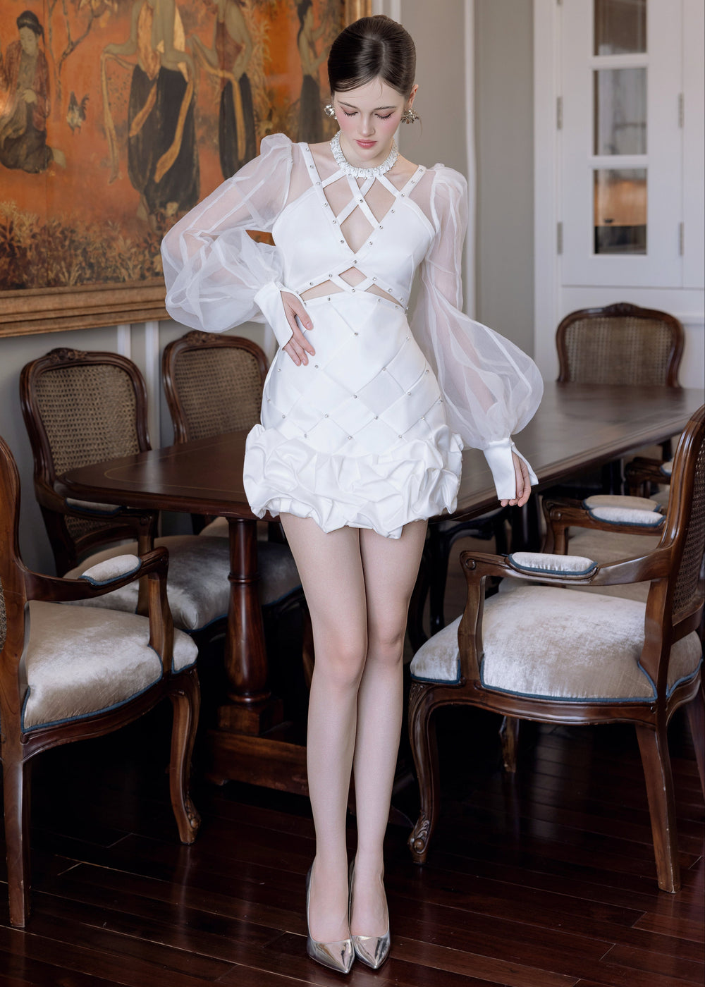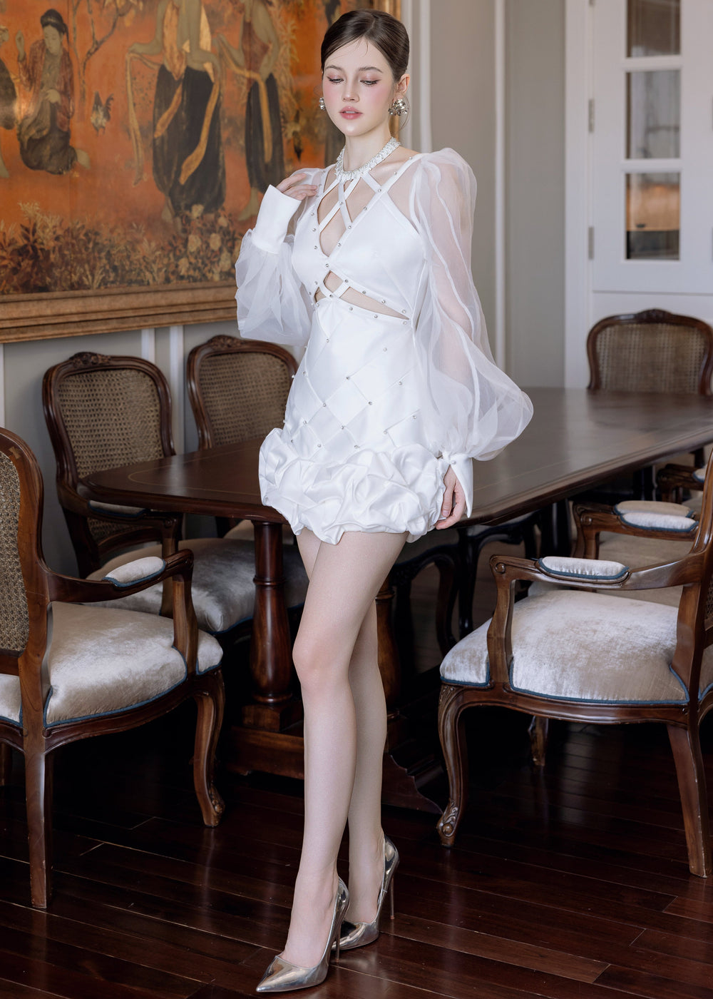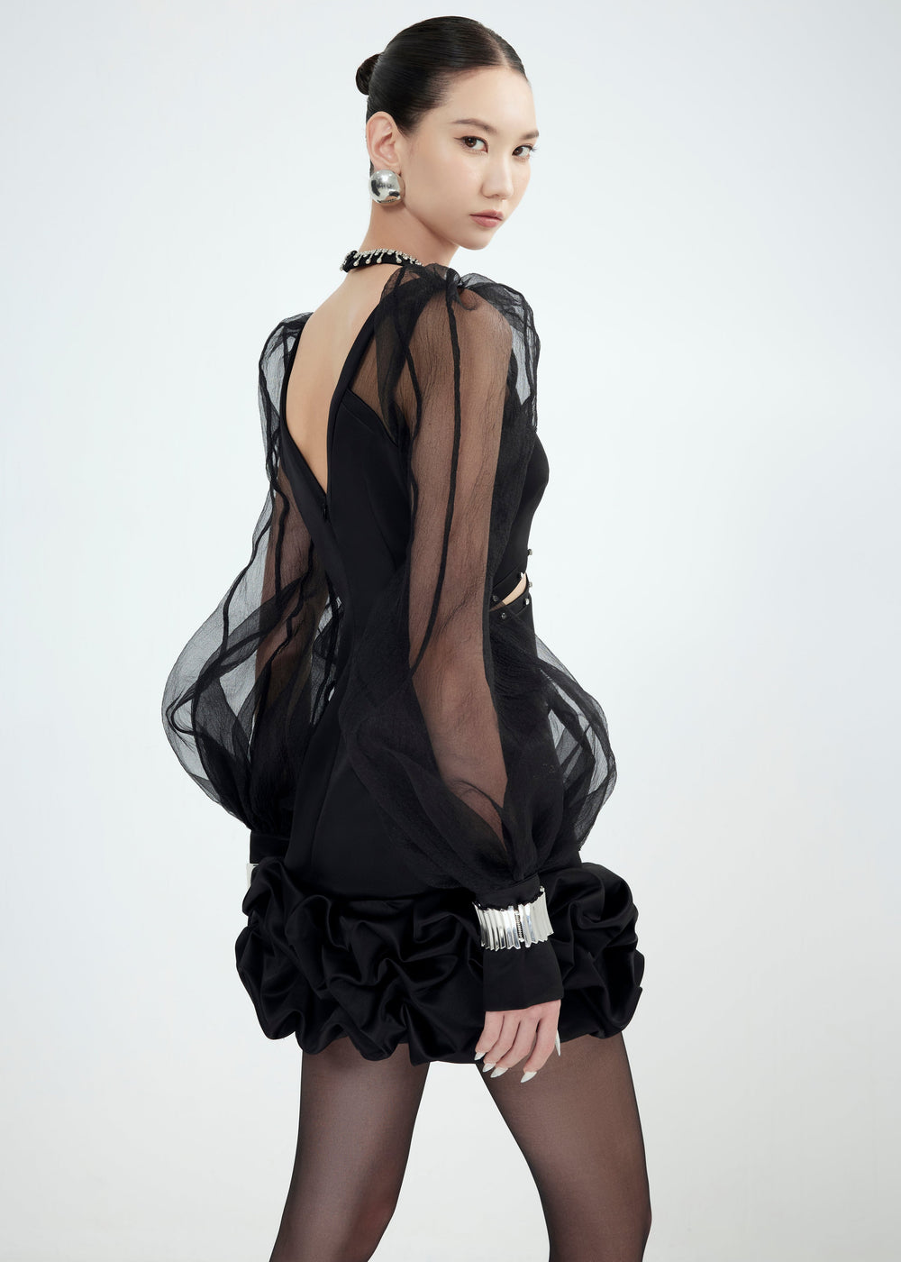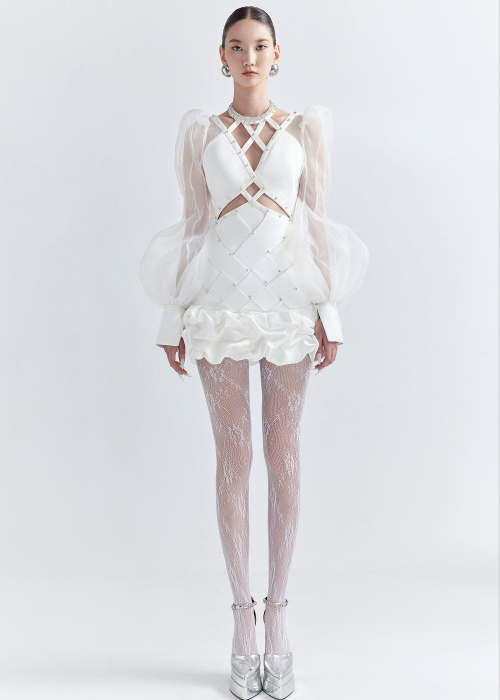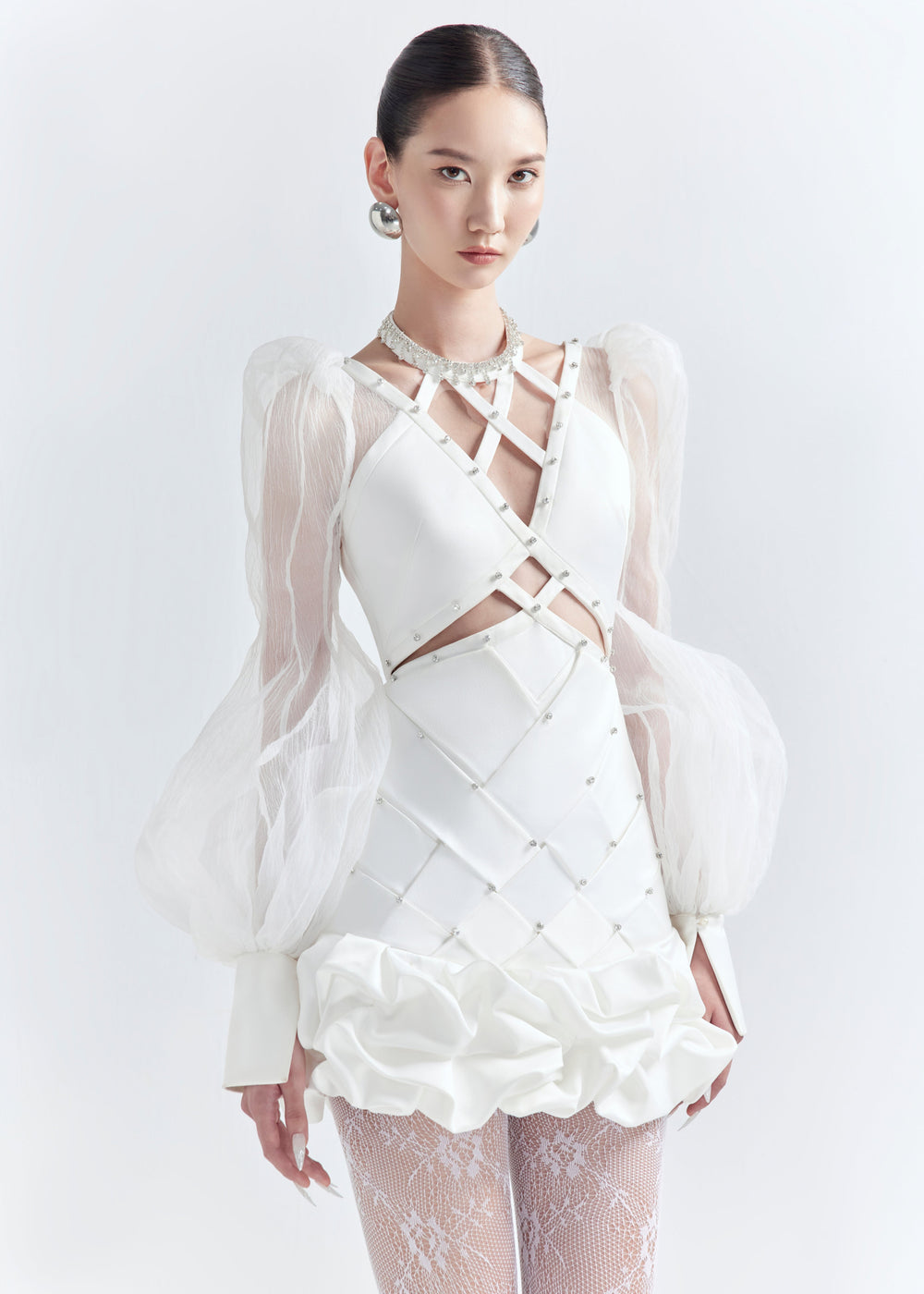 SAPPHIRE DREAM is a radiant, mysterious, and captivating design. The look is elevated by sheer, voluminous chiffon sleeves that bring a refined sense of romance. The cut-out bodice features an intricate crisscross patchwork construction, creating an artistic sense of movement. Shimmering stones embellish the surface like light dancing across a sapphire, transforming the piece into a statement of wearable jewelry that allows the wearer to shine in every moment.