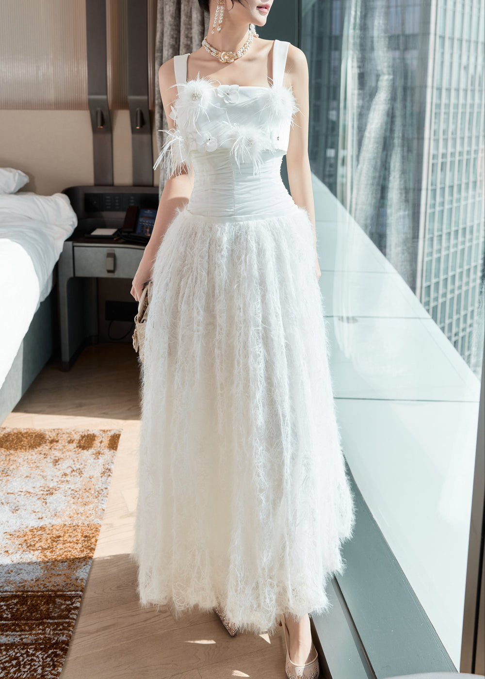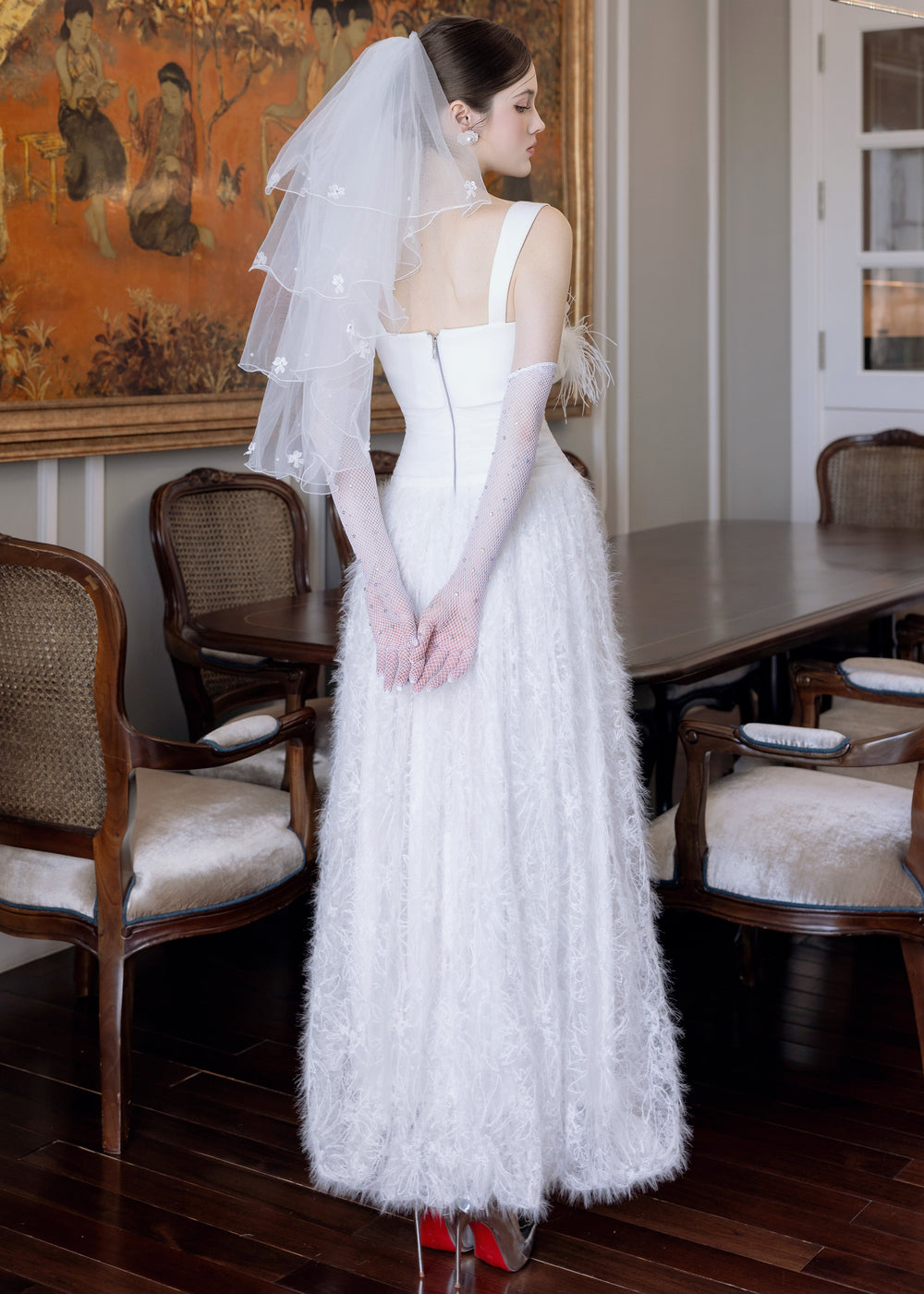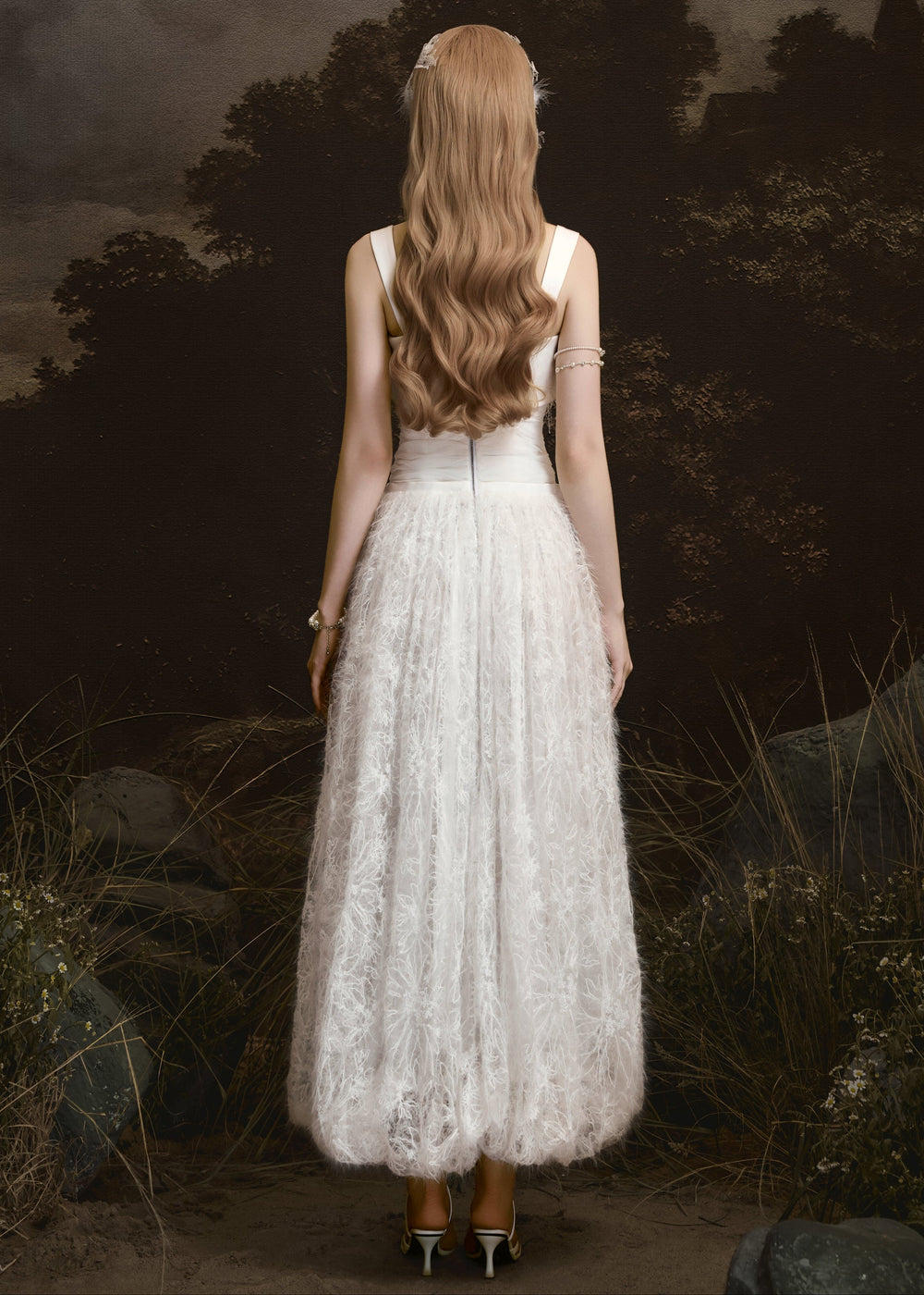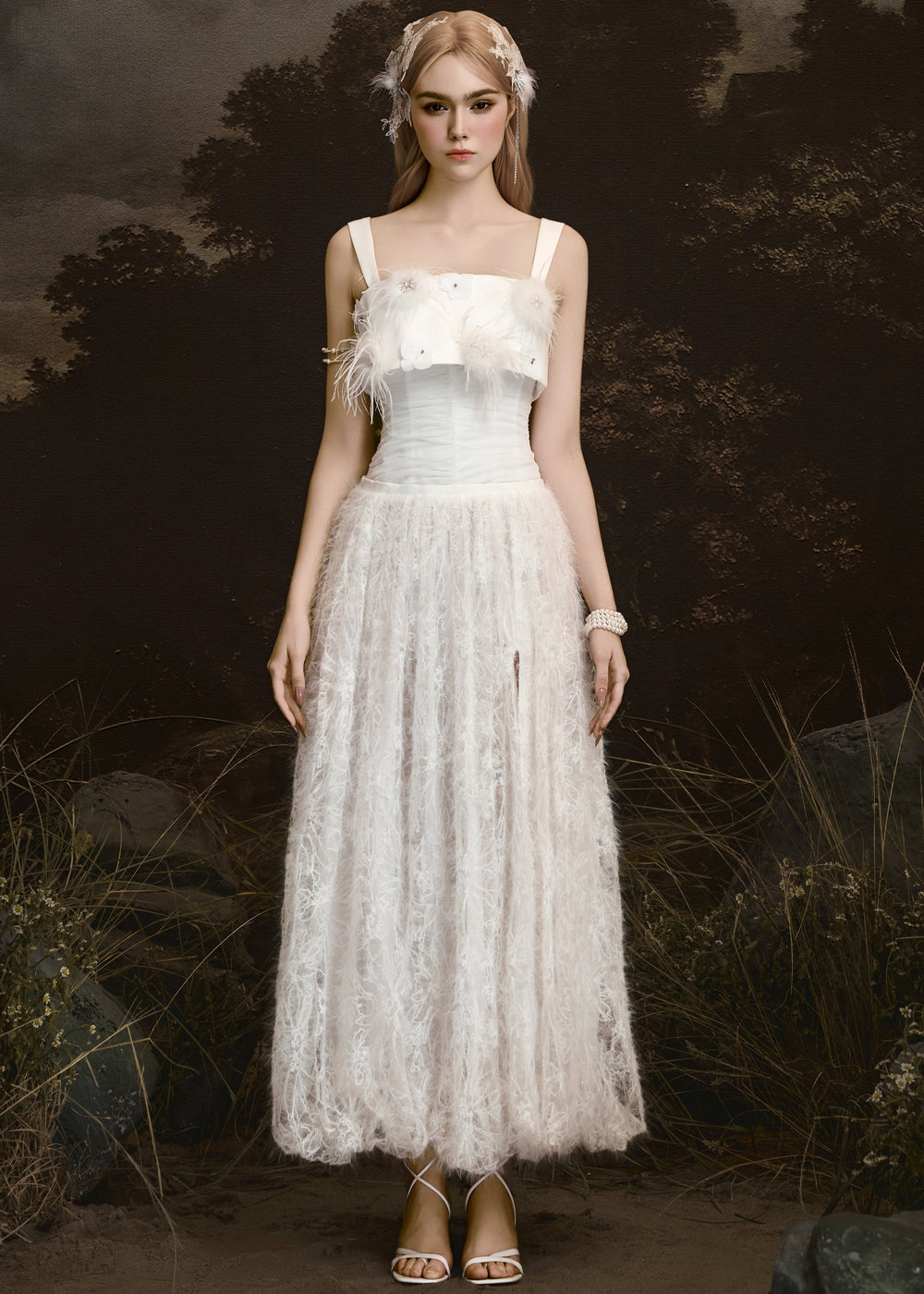 Velvet Whisper embodies a refined balance between delicate beauty and confident sophistication. Feather-light textures move as softly as air, complemented by hand-applied floral embellishments accented with shimmering crystals to create a mesmerizing visual effect. The sculpted corset contours the body, highlighting a sense of elevated, modern femininity. Sensual yet elegant, this design radiates true couture refinement.